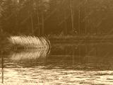 Jezioro położone w sosnowym lesie. Pośrodku znajduje się mała wyspa porośnięta wysokimi trawami. Jest jesień, trawa ma brązowy kolor.