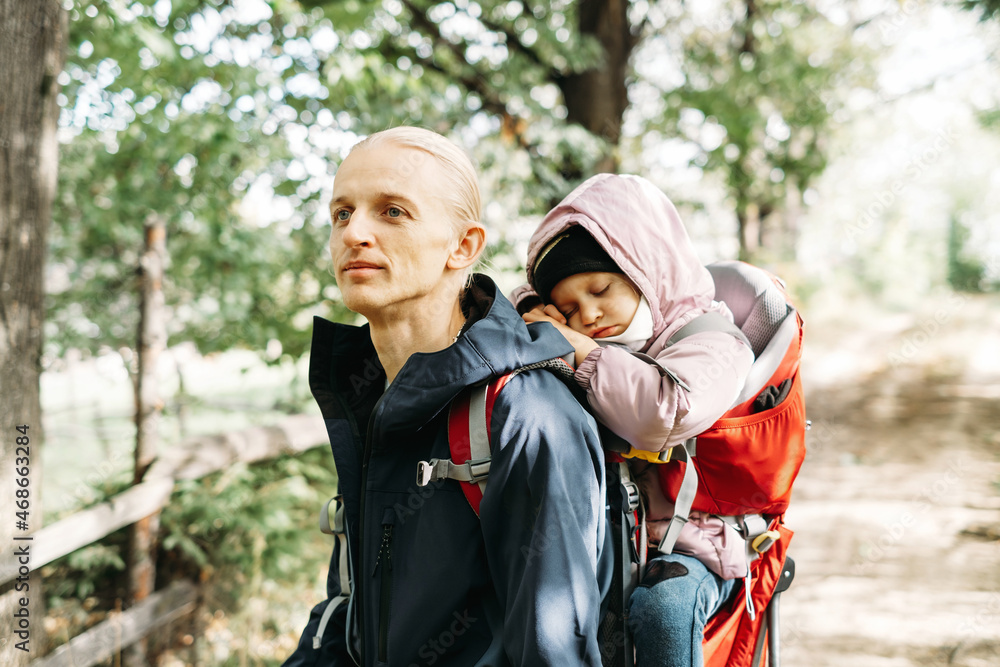 Man hiking with sleepy toddler child in the mountain. Kid sitting in backpack on father back. Active family adventure in forest with tired girl. Cold weather trip, Nordic walk tour