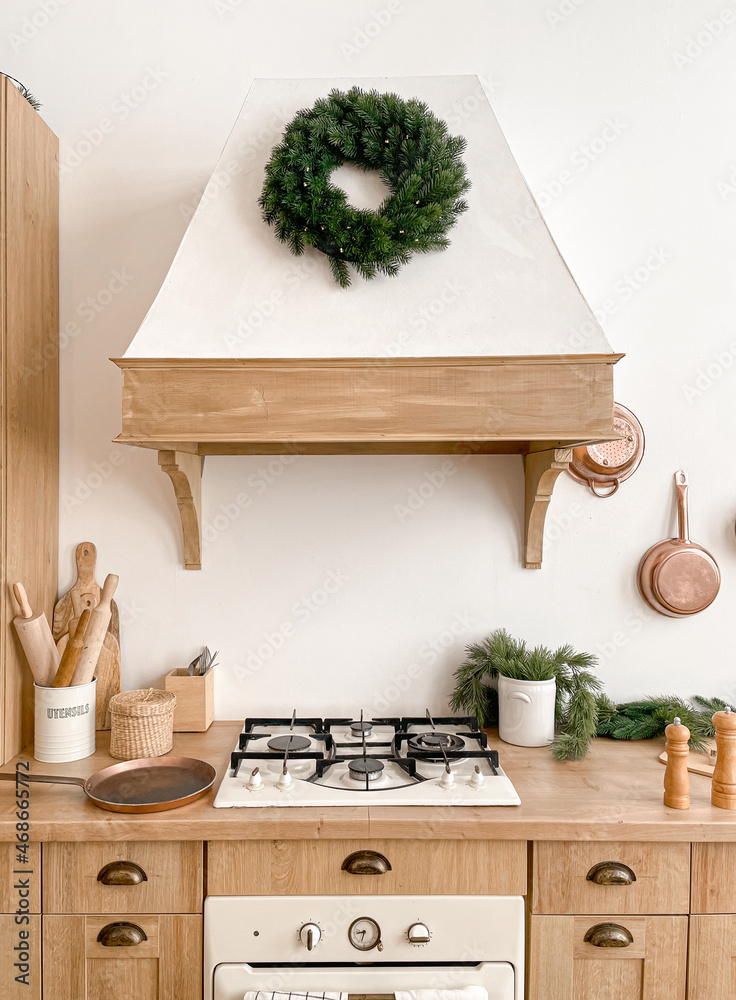 Christmas kitchen counter with stove and hood in light bright modern festive cozy interior with New Year decorations, Christmas wreath, utensils, tableware, copper pans, cooking dinner concept