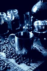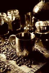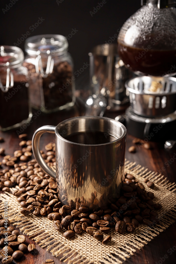 Metallic cup and vacuum coffee maker also known as vac pot, siphon or syphon coffee maker and toasted coffee beans on rustic wooden table