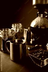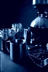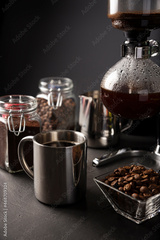 Vacuum coffee maker also known as vac pot, siphon or syphon coffee maker. Metallic cup and toasted coffee beans on rustic black stone table.