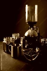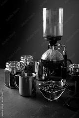 Vacuum coffee maker also known as vac pot, siphon or syphon coffee maker. Metallic cup and toasted coffee beans on rustic black stone table