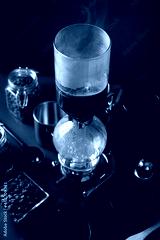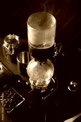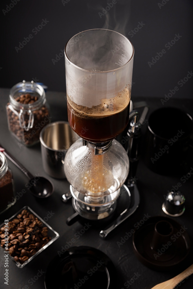 Vacuum coffee maker also known as vac pot, siphon or syphon coffee maker and toasted coffee beans on rustic black stone table.