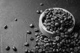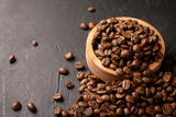 Organic toasted coffee beans on rustic black stone table with copy space for your text. Close up image