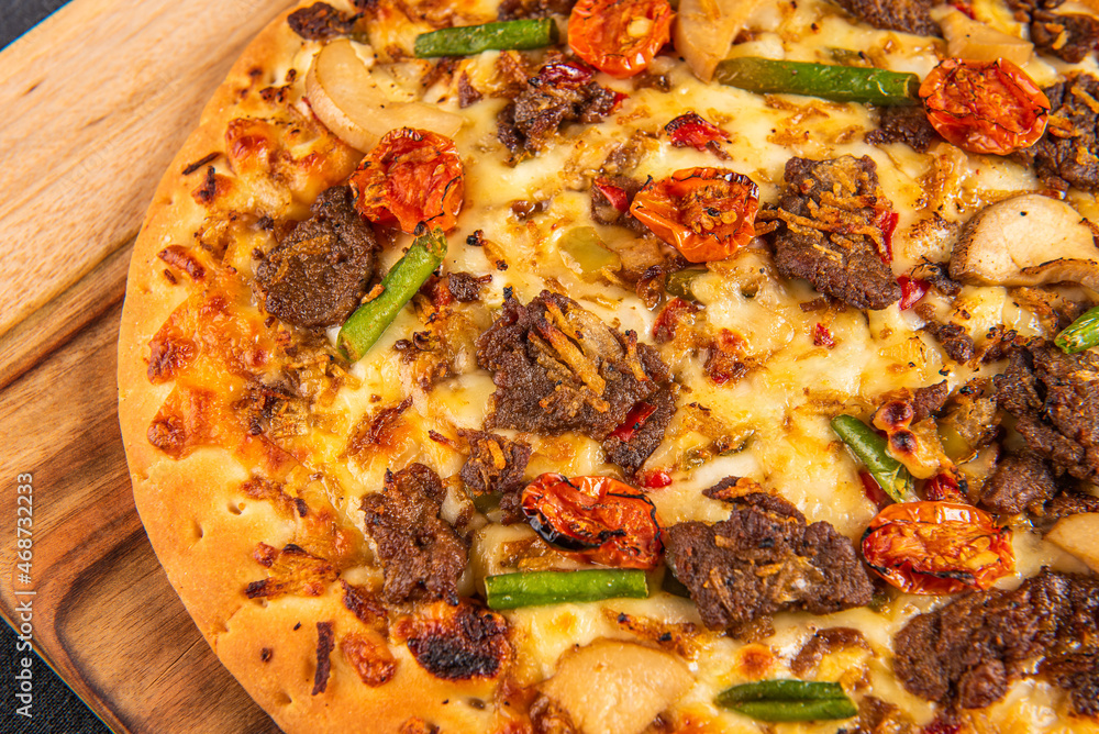 신선한 재료로 만든 토핑을 올린 맛있는 이탈리아 전통 피자