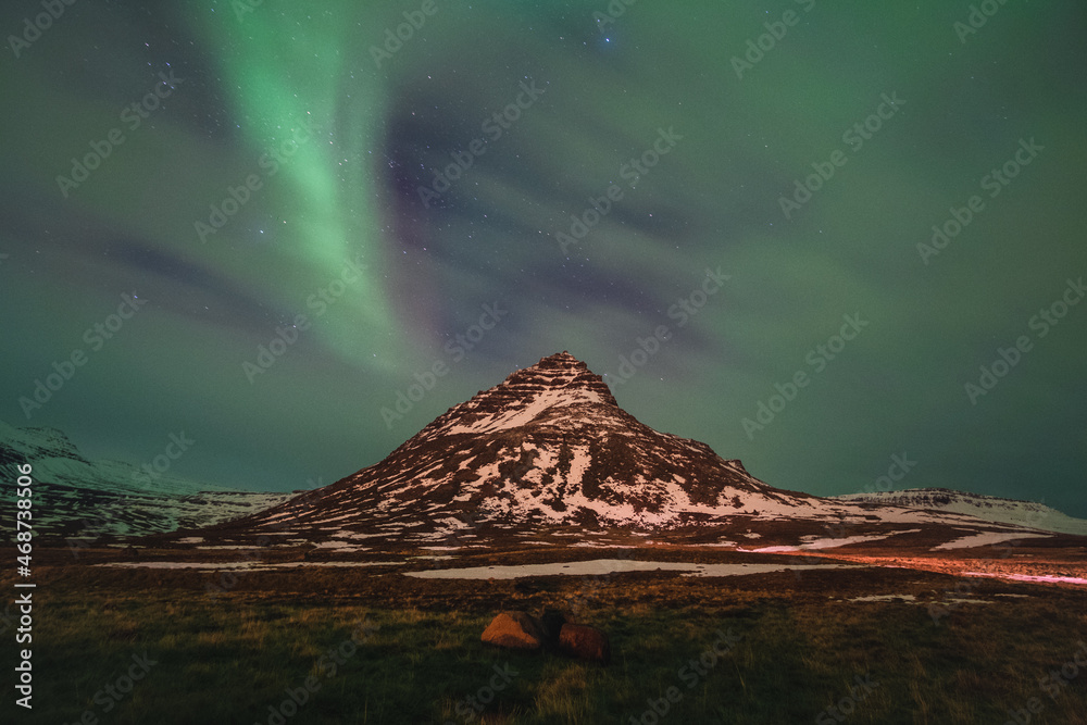 Magnifiques aurores boréales au dessus d'une montagne en Islande