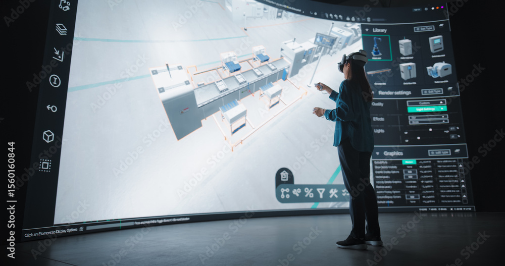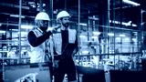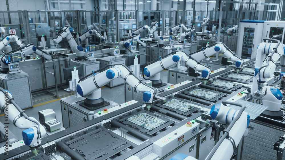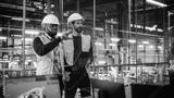 Car Factory: Project Manager and Automotive Engineer in Hard Hat, Talking, Using Laptop. Monitoring, Control, Equipment Production. Automated Robot Arm Assembly Line Manufacturing Electric Vehicles