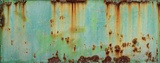 turquoise blue and green wall or surface of a fence of metal, with orange grooves from rust and irregular chipping - weathered texture for the background of a steampunk wallpaper