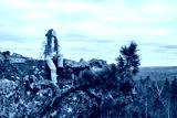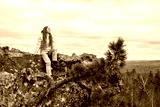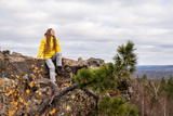 A smiling tourist, in a yellow jacket and gray pants, sits on the top of a mountain, in a beautiful valley with mountains and cloudy skies, admiring the beauty of nature.