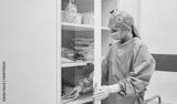 Krankenschwester mit Mundschutz sucht Pflegehilfsmittel