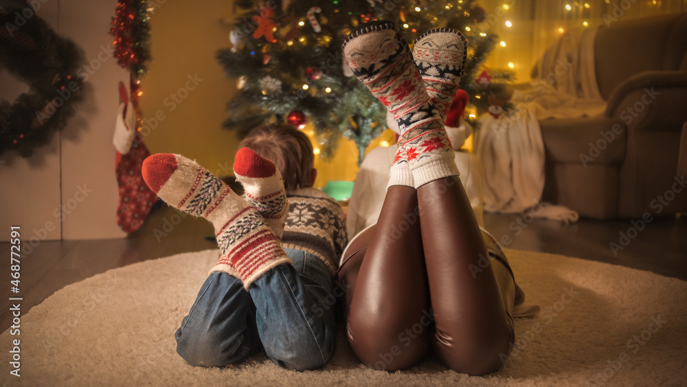 Closeup of family in knitted wool socks looking on decorated Christmas tree at house. Pure emotions of families and children celebrating winter holidays.
