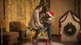 Happy cheerful mother with son dancing and having fun next to Christmas tree in living room. Pure emotions of families and children celebrating winter holidays.
