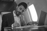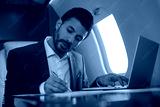 Handsome Arabian businessman using laptop computer, typing, working online sitting in airplane. Confident middle eastern entrepreneur taking notes, signs contract flying luxury private jet