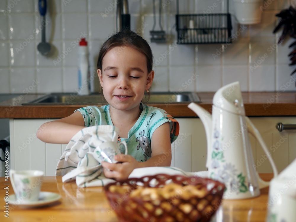 A six year old girl in the kitchen at the table wipes tea cups. Raising children.