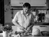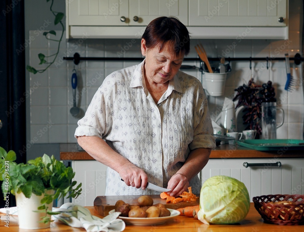 A retired woman in the kitchen prepares soup with ingredients spread on the table. Healthy homemade food. The life of the elderly.