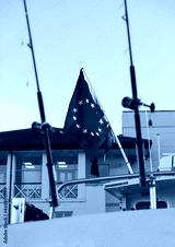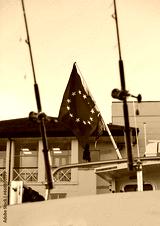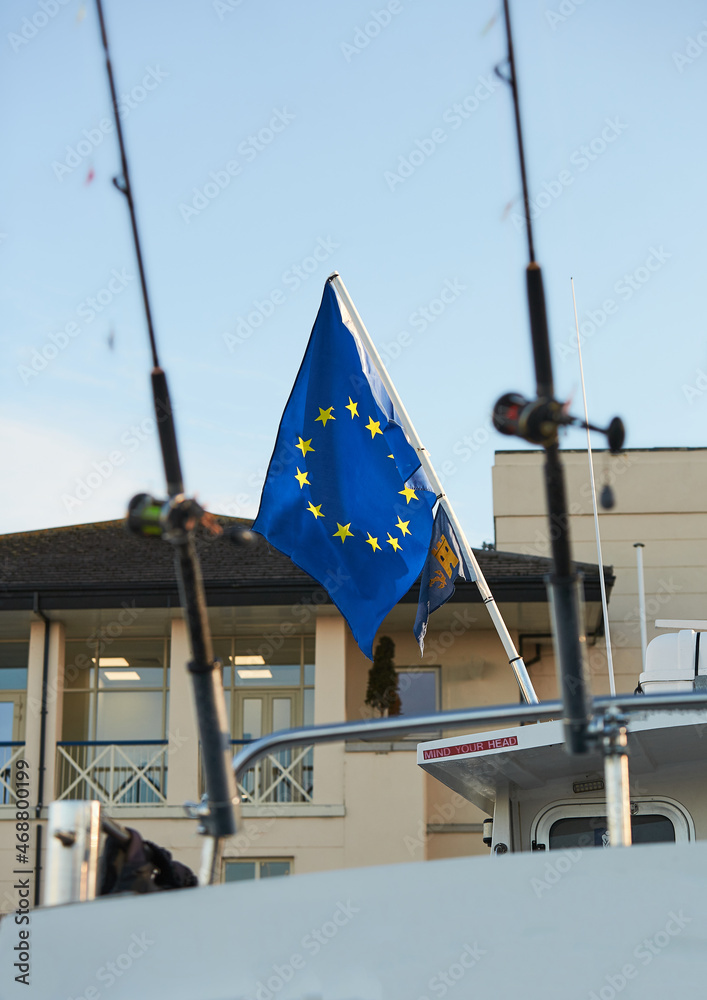Fishing rods with European flag on the boat in natural setting