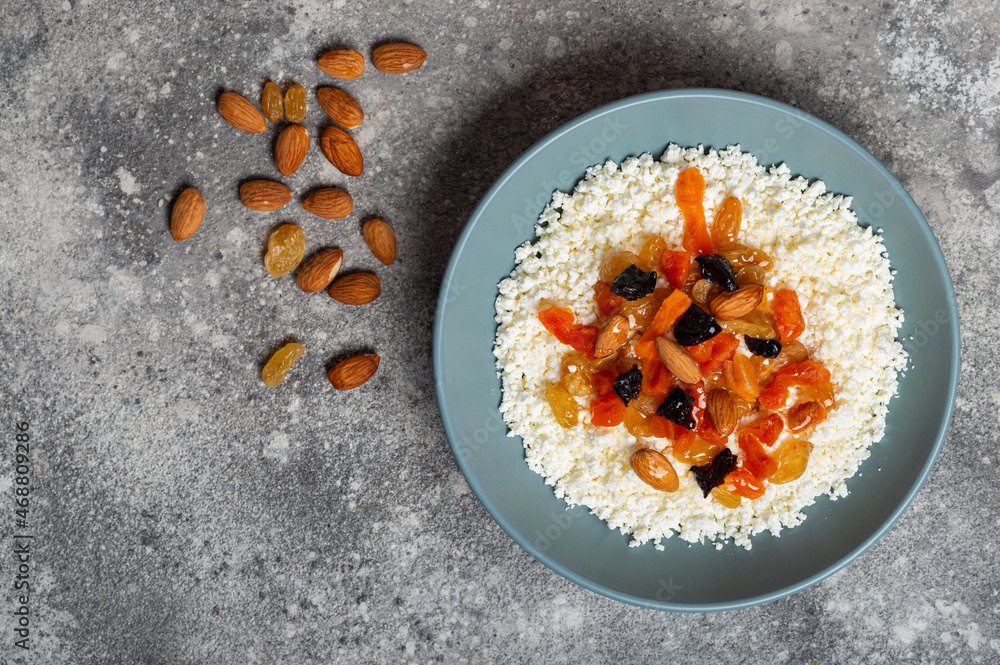 Cottage cheese with dried fruits in a plate top view copy space