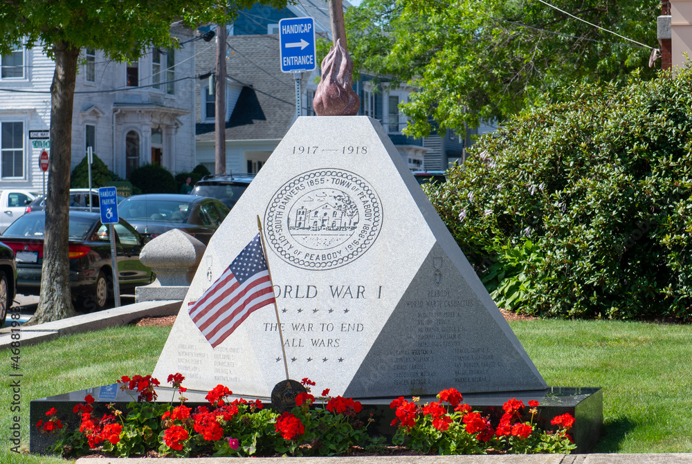 World War, Korean War and Vietnam War memorial monument in front of City Hall in downtown Peabody, Massachuseets MA, USA.