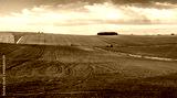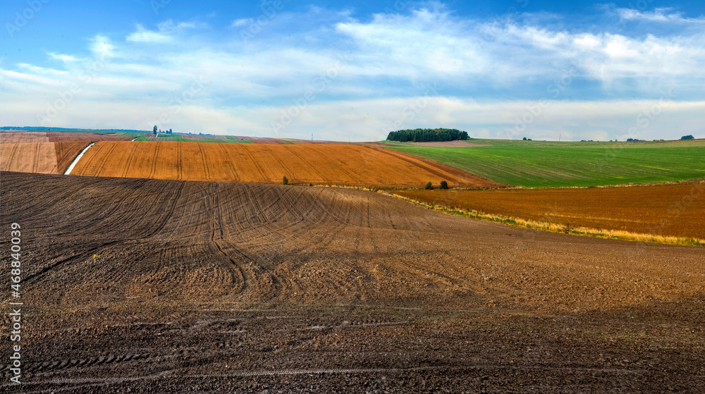 plowed field and soybean brown field in autumn and winter cereals in the distance, patchwork and field lines, geometry