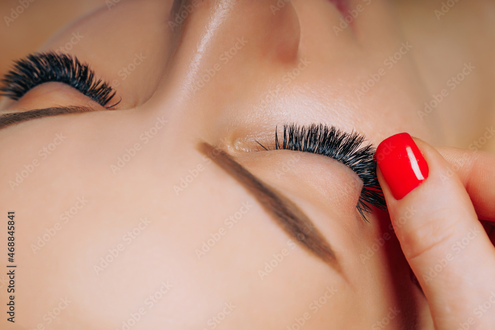 Eyelash Extension Procedure. Woman Eye with Long Eyelashes. Close up, selective focus.