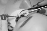 Eyelash Extension Procedure. Woman Eye with Long Eyelashes. Close up, selective focus.