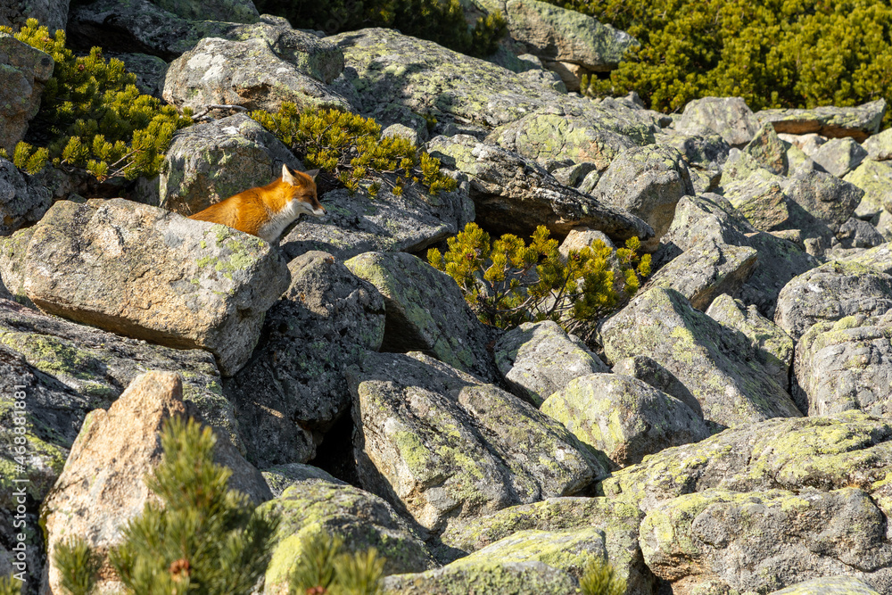 The ginger fox in the wild in High Tatras mountains. Slovakia.