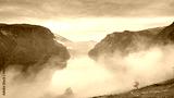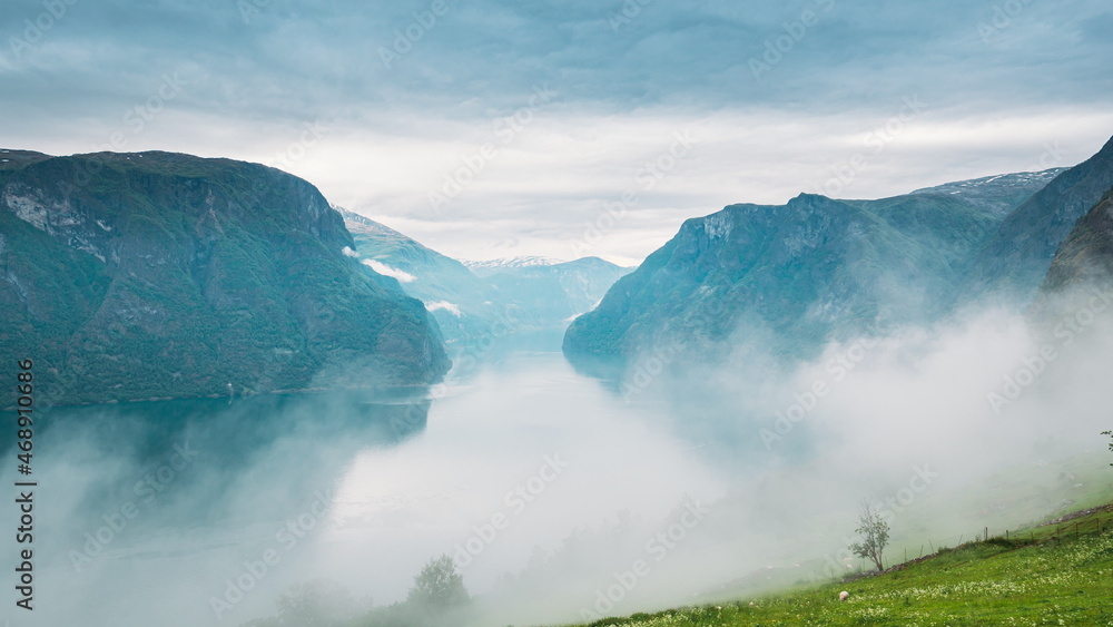 Sogn And Fjordane Fjord, Norway. Amazing Fjord Sogn Og Fjordane. In Fog Clouds. Summer Scenic View Of Famous Natural Attraction Landmark And Popular Destination In Summer 4K. Misty Weather