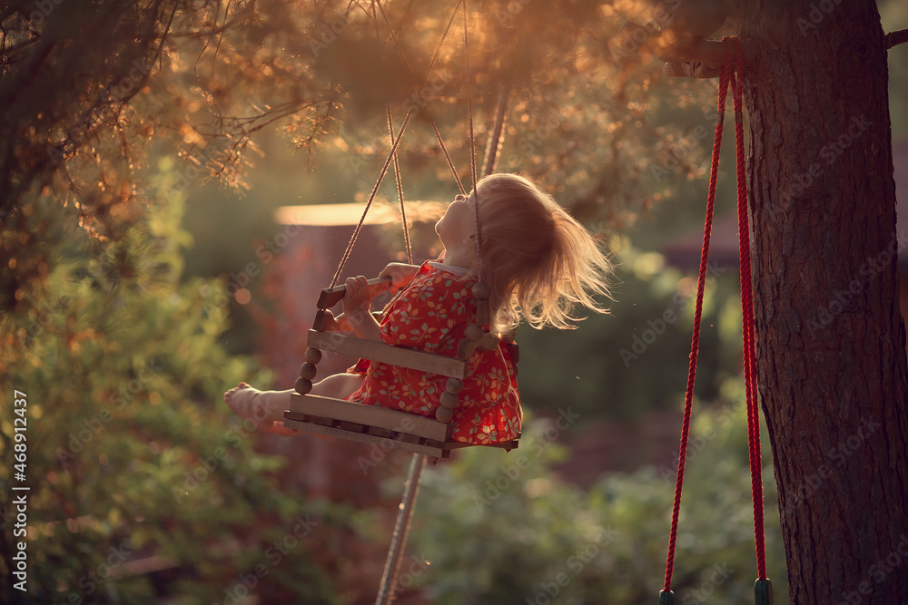 Cute baby girl is swinging on a wooden swing during the sunset. Image with selective focus and toning