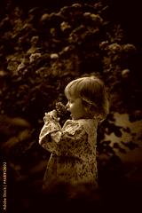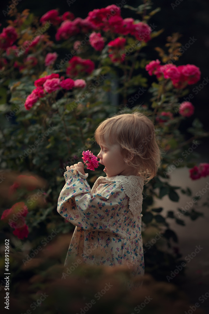 Beautiful baby girl is smelling roses in the summer garden. Image with selective focus and toning