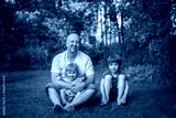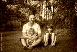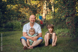 A boy and little girl are hugging their father in summer park. Image with selective focus and toning