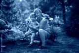 Portrait of grandmother and her little granddaughter in yellow dress in summer. Image with selective focus and toning