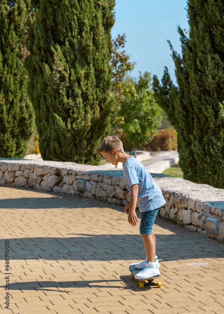 Kid boy learning to ride skateboard in park. Shirt mockup