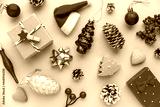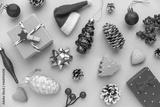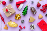 Christmas composition flatlay on purple background. Minimal creative christmas gifts, red and gold, fir branches and red berries. Christmas, new year concept, winter