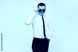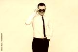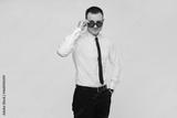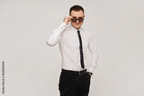 A young successful confident guy in a white shirt and a black tie adjusts his sunglasses on a gray background. Isolated with copy space