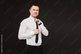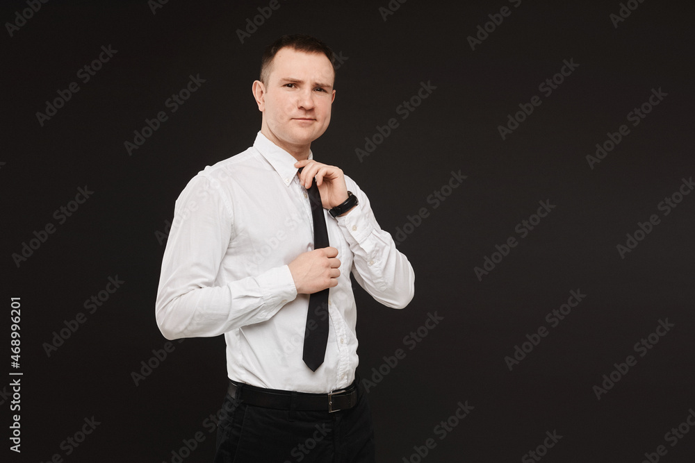 A young successful confident businessman in a white shirt and a black tie on a black background. Isolated with copy space