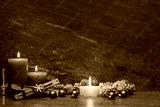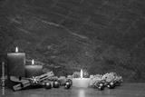 Weihnachtshintergrund: Braune Kerzen mit Ski und Weihnachtsschmuck.