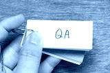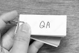 Man hold the flash card with handwriting word QA (abbreviation of quality assurance or question and answer) on wood background