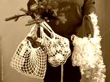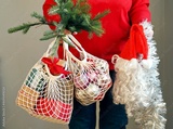 Christmas background.Preparing for the Christmas holidays and New Year.Gifts and decorative ornaments in natural mesh bags with spruce branches were purchased.