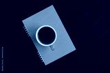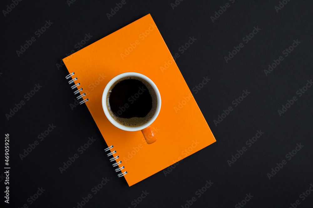 Top view of orange coffee cup on the orange notebook on the black background. Copy space. Close-up.