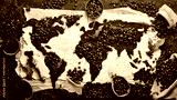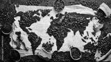 Set of coffee beans and ground coffee in the shape of a world map. Top view. On a dark background.