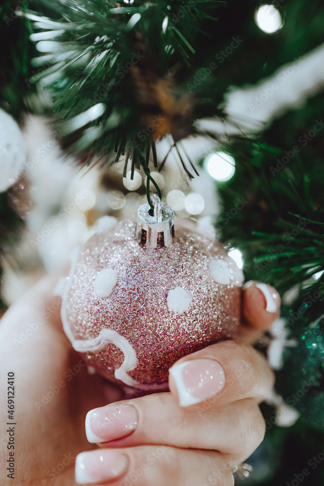 Female hand holding Christmas toy pink shining ball hanging on the Christmas tree