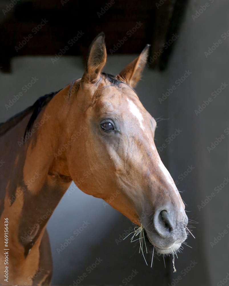 Racehorse behind brown wooden fence at rural animal farm