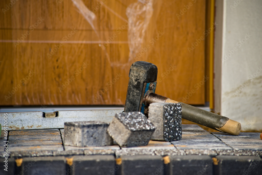 Budowa schodków z kostki brukowej . Schody , chodnik , bruk .Building steps made of cobblestones. Stairs, sidewalk, pavement.