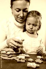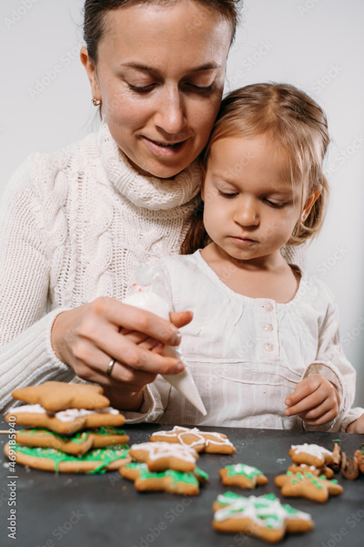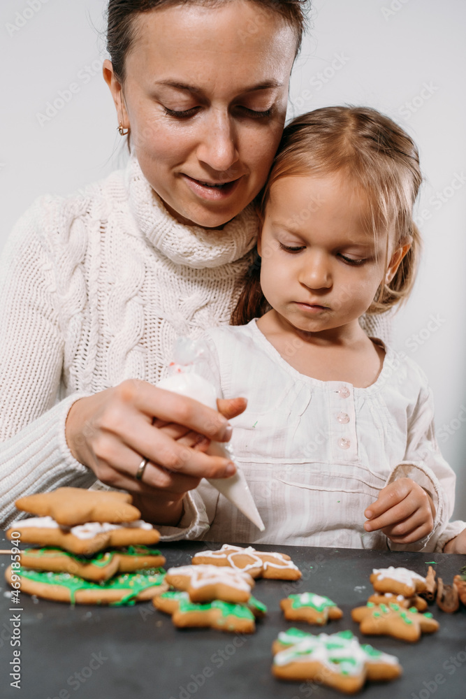 Mother with child decorating gingerbread cookies with icing for Christmas. Homemade festive food. Cute toddler girl Family Workshop. Stars, tree
