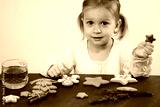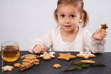 Child cooking and eating home made gingerbread cookies, stars, man. Happy toddler girl celebrated Christmas eve at home, Kid decorating pastry with icing. Copy space over plain wall