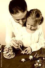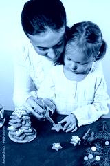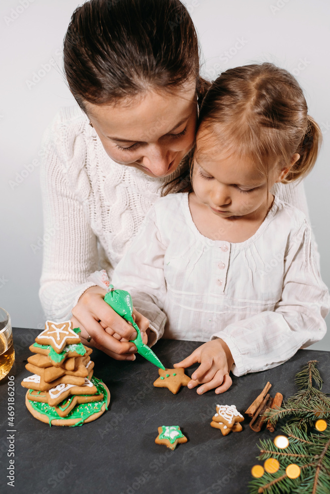Mother with child decorating gingerbread cookies with icing for Christmas. Homemade festive food. Cute toddler girl Family Workshop. Stars, tree