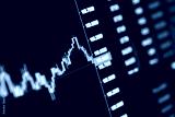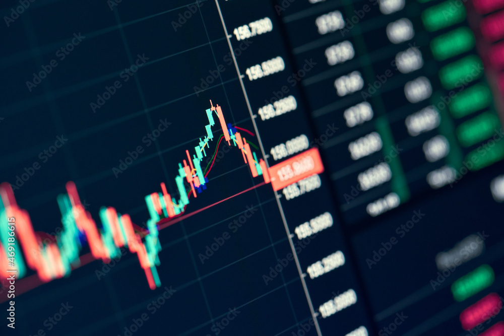 Stock exchange online trading platform chart falling price graph candlesticks bars indexes digital data on cryptocurrency global trade market platform. Computer screen closeup view background.