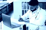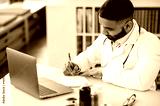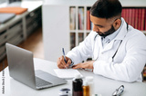 An Indian doctor conducts an online consultation with patient. A general medicine doctor communicates with patient via video call by laptop, records complaints, prescribes treatment, answers questions