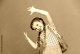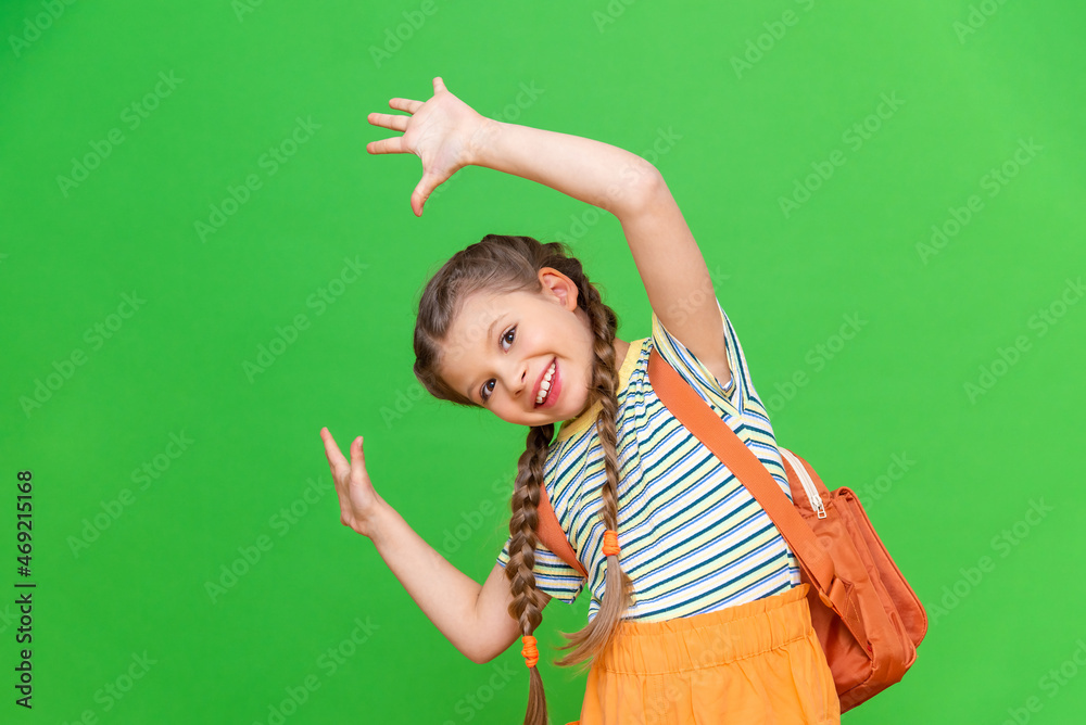 a little girl with a briefcase is fooling around a lot. Green isolated background.
