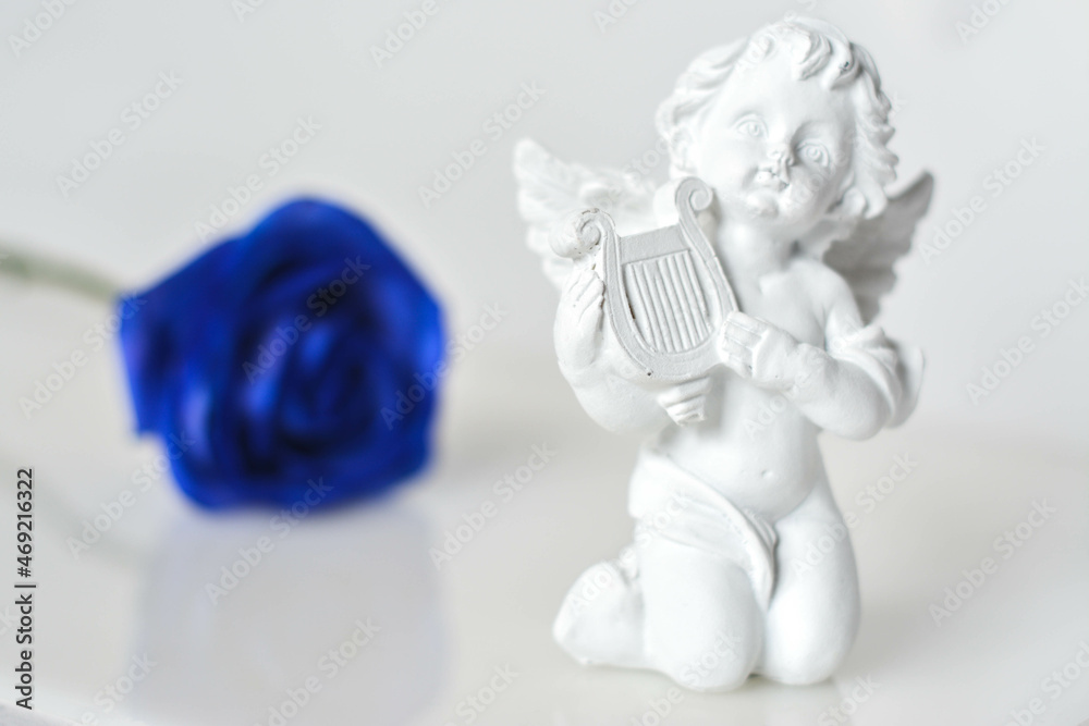 Ceramic figure of an angel on the white glossy surface and a blue rose behind